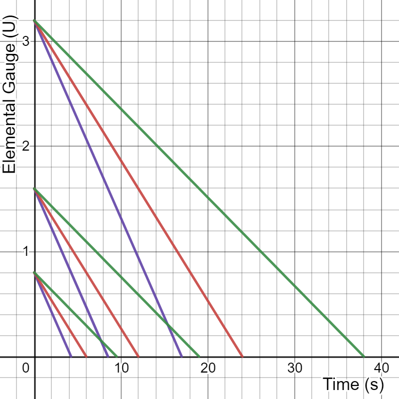 Additional applications of the aura Element will apply their own respective gauges, but follow the decay rate of the original aura. Meaning, a 2U or 4U Elemental Gauge can be decaying at the rate of D(1). To do this, apply a 1U gauge, then apply a 2U or 4U gauge of the same Element to get 1.6U or 3.2U auras that decay by 11.875s per unit.